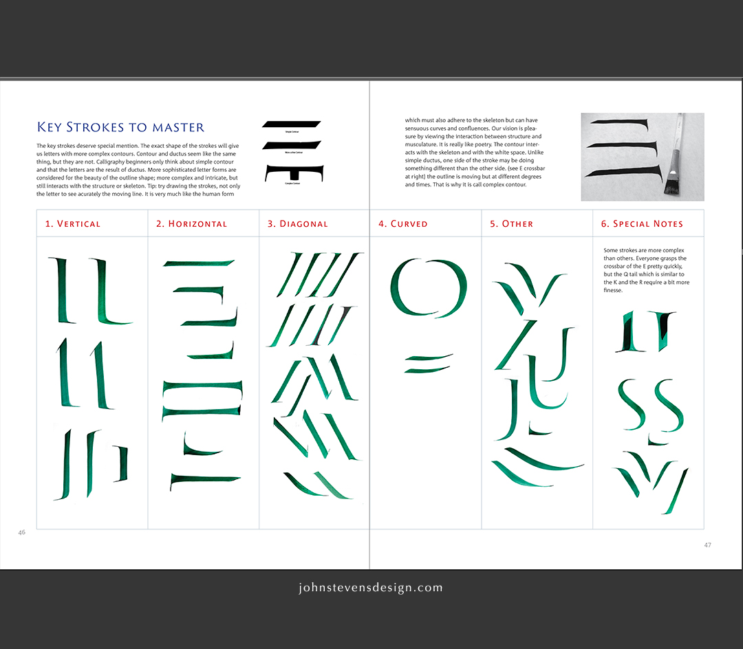 In this practical book, John Stevens shares his brush knowledge and provides exercises developed and refined over many years of teaching brush lettering workshops. This is a progressive program of instruction that leads to classic Trajan Capitals – and beyond. He introduces you to the brush and how it contrasts with the pen. Brush techniques follow, where you learn how to prepare, hold, and load your brush. Brush dynamics are discussed as you make your first strokes. You learn how the brush moves when you change angles and make curves and other turns. You get to know the broad brush better with a first alphabet, Neuland. You learn basic strokes, joins, and special strokes. You explore texture and rhythm. From the angular Neuland, you move on to a rounded Roman Capital form. Then from that alphabet, you move to extensive instruction for the Trajan letterforms, including a full-size exemplar alphabet spanning 27 pages. Final chapters take your letters into words and works, cover other alphabets and variations, and present a gallery full of inspiration.