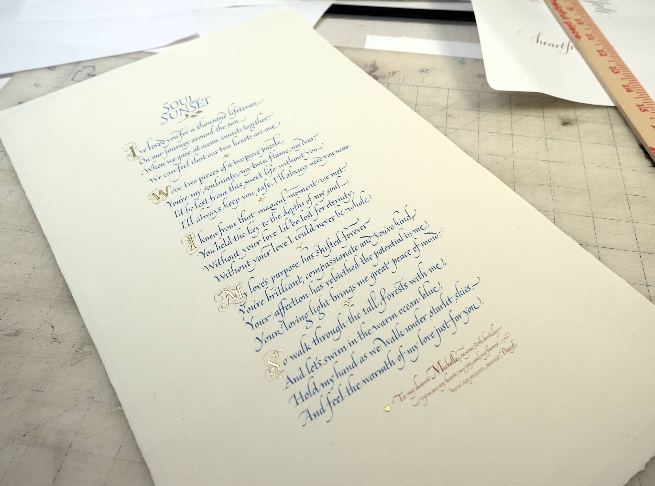 Discover the beauty of handcrafted calligraphy, where the written word becomes art. Using the finest papers and inks, each piece reflects centuries of tradition infused with a modern, contemporary style.